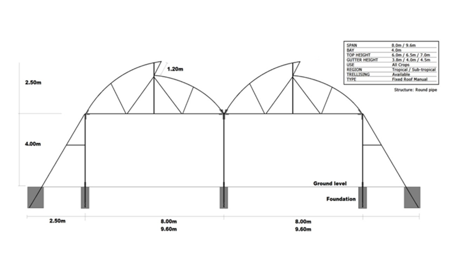 Same as Naturally Ventilated but with two sides ventilation which helps to better management of temperature and helps in lowering the diseases. This design is suitable for almost all crops as more ventilation & Air Circulation with facilitate Pollination also specially those areas where temperature in summer is too high. Most Crops have highest value in Summer so this design is a blessing. Also the Grid width is 9.6mtr so provide more area for working inside the Greenhouse